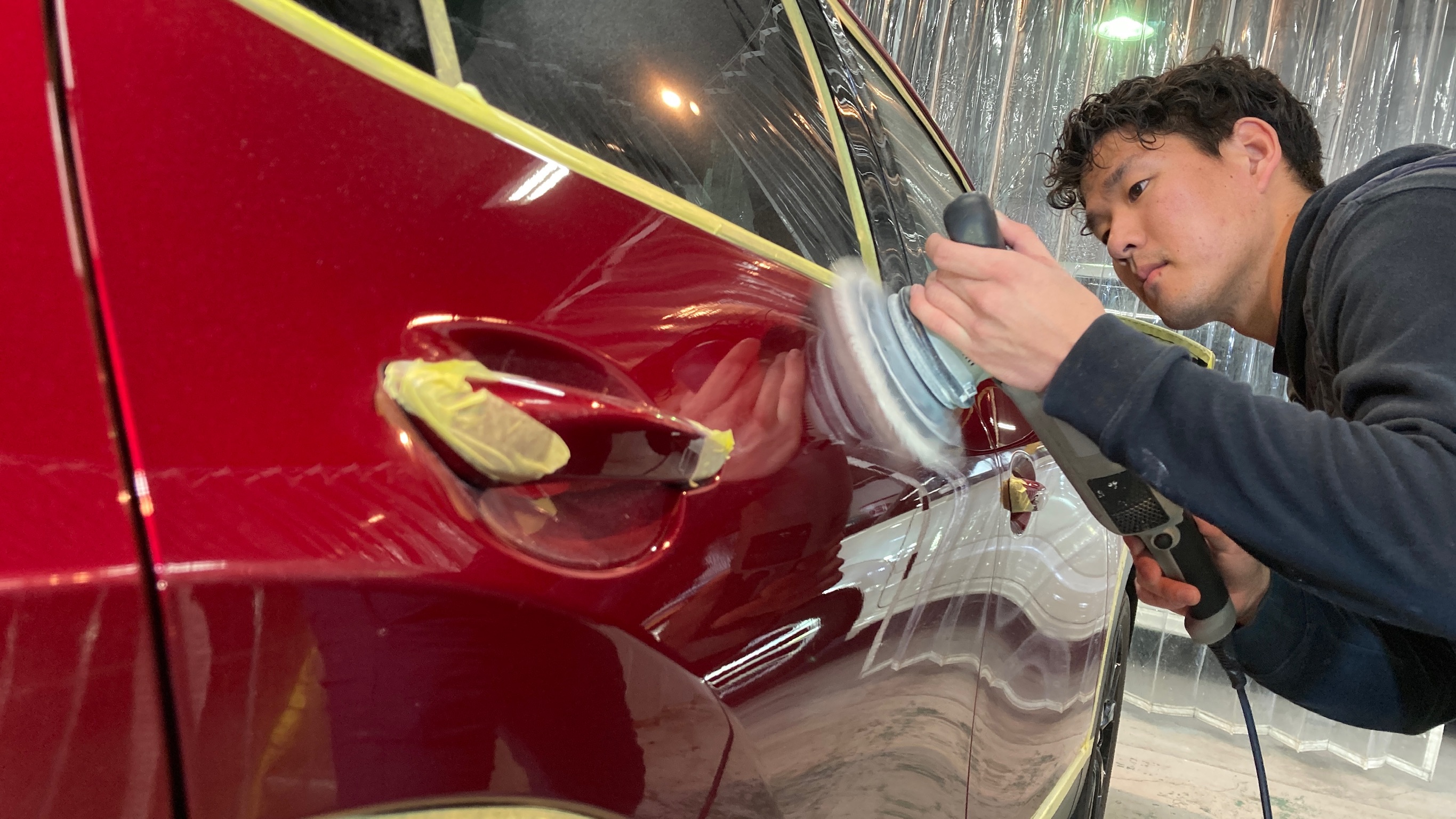 次に、水気を飛ばしマスキングテープを貼った後に磨き開始です!