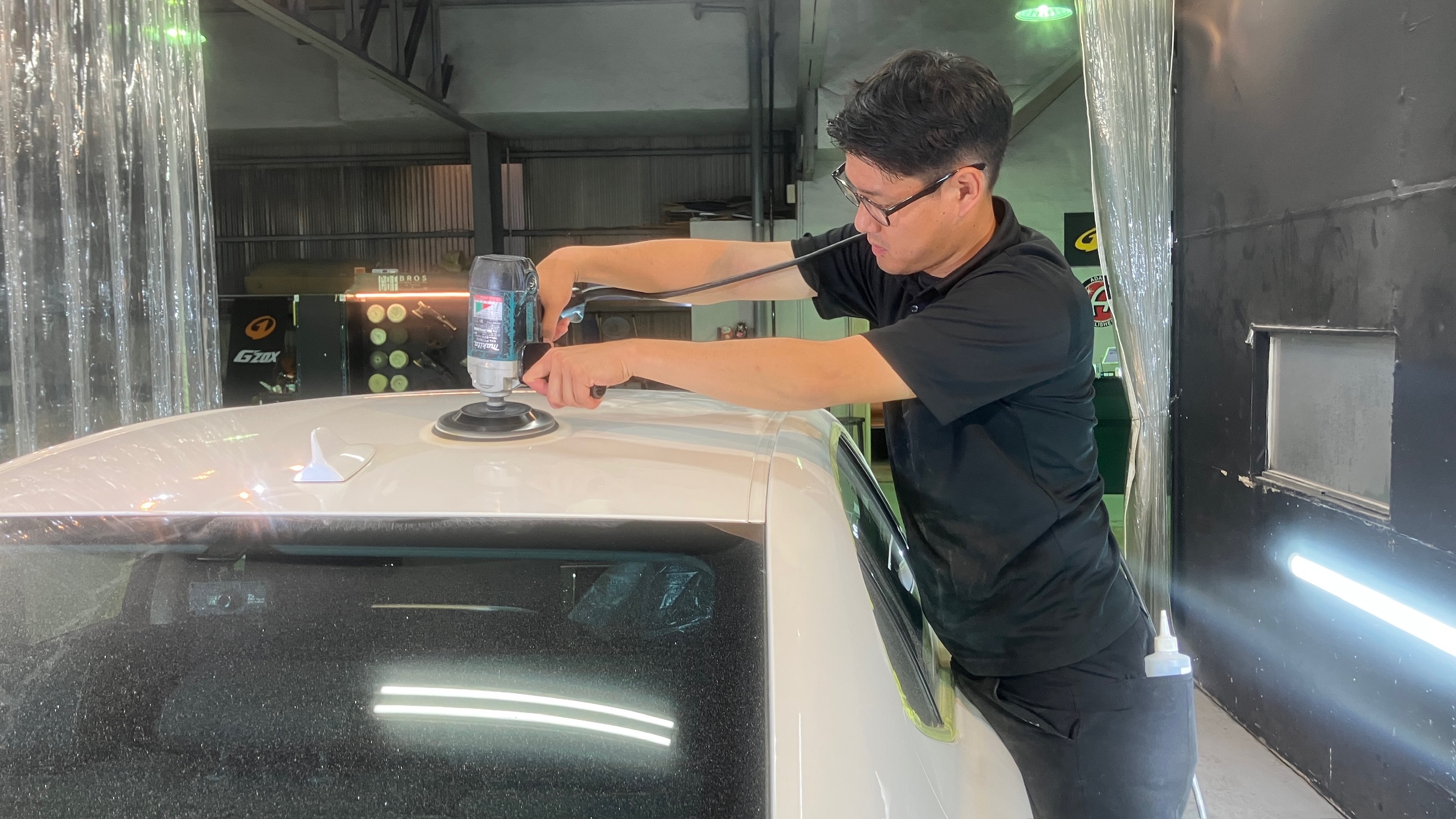 ポリッシャー(磨き機材)を使用して、シミやキズが目立ちやすいボンネットやルーフなどの上面を軽研磨していきます。