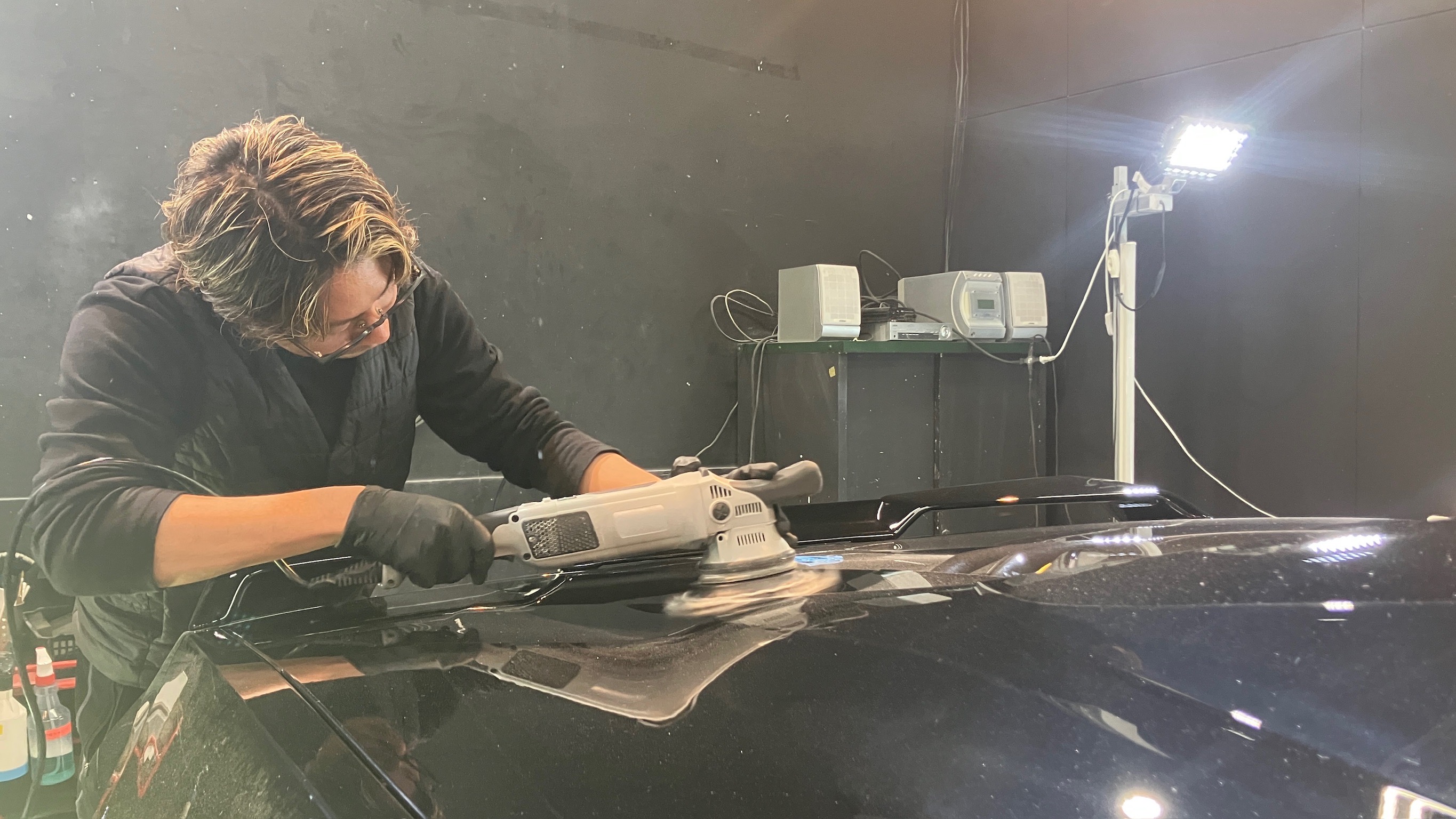 ポリッシャー(磨き機材)を使用して、シミやキズが目立ちやすいボンネットやルーフなどの上面を軽研磨していきます。